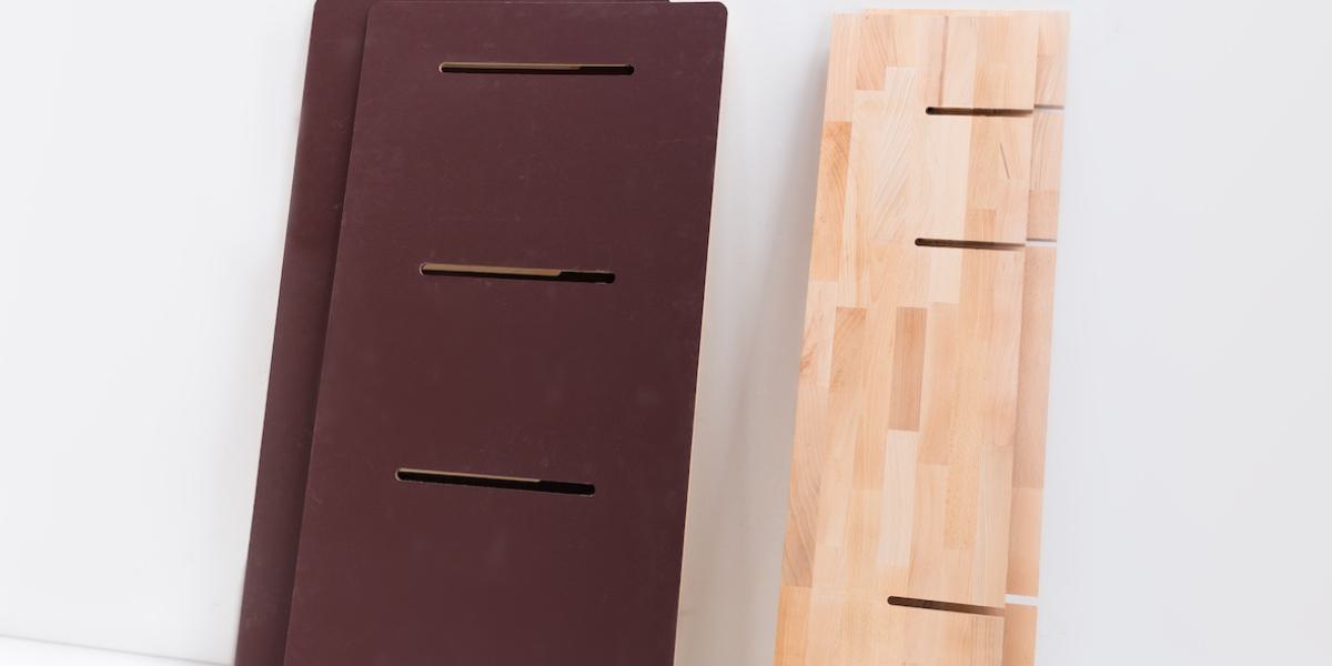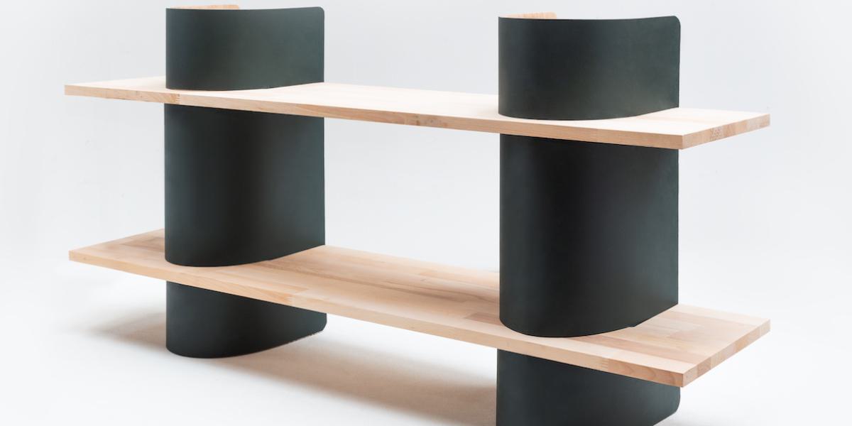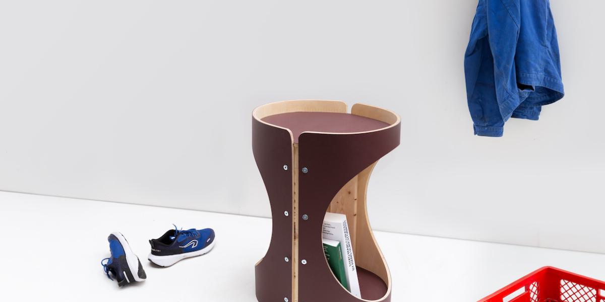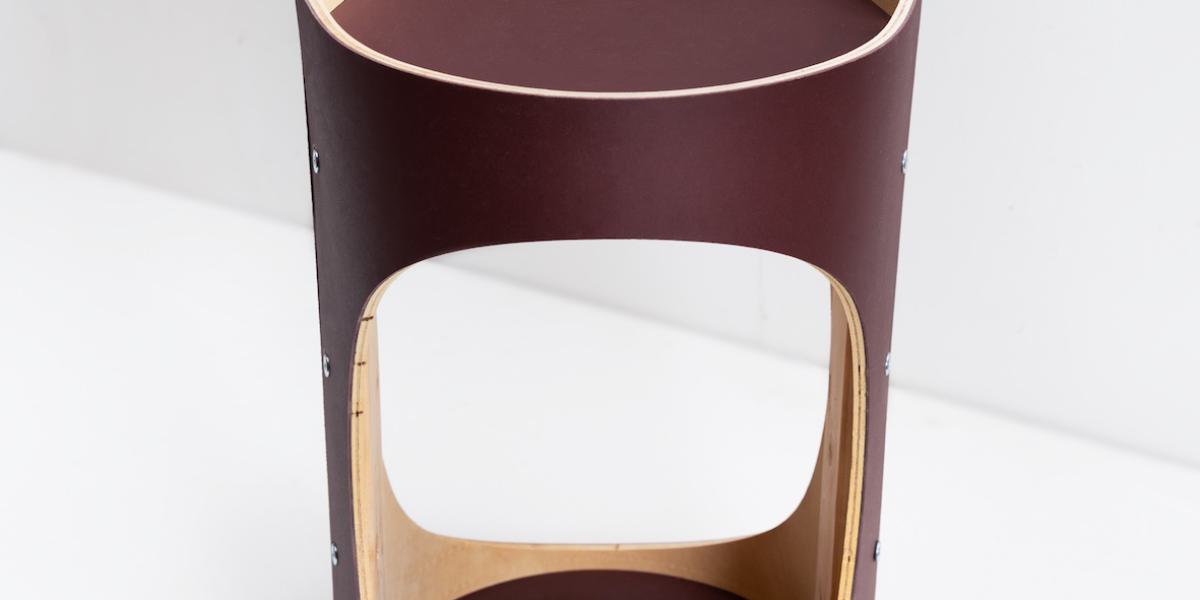 Flexible plywood, finished with linoleum, is wrapped around cut-outs to create light yet strong forms. The design makes optimal use of the material’s properties and prevents production waste. By showing the furniture both assembled and in separate parts, the construction becomes transparent and easy to read. The collection consists of a side table and a cabinet, designed for CNC production and flat-pack shipping.