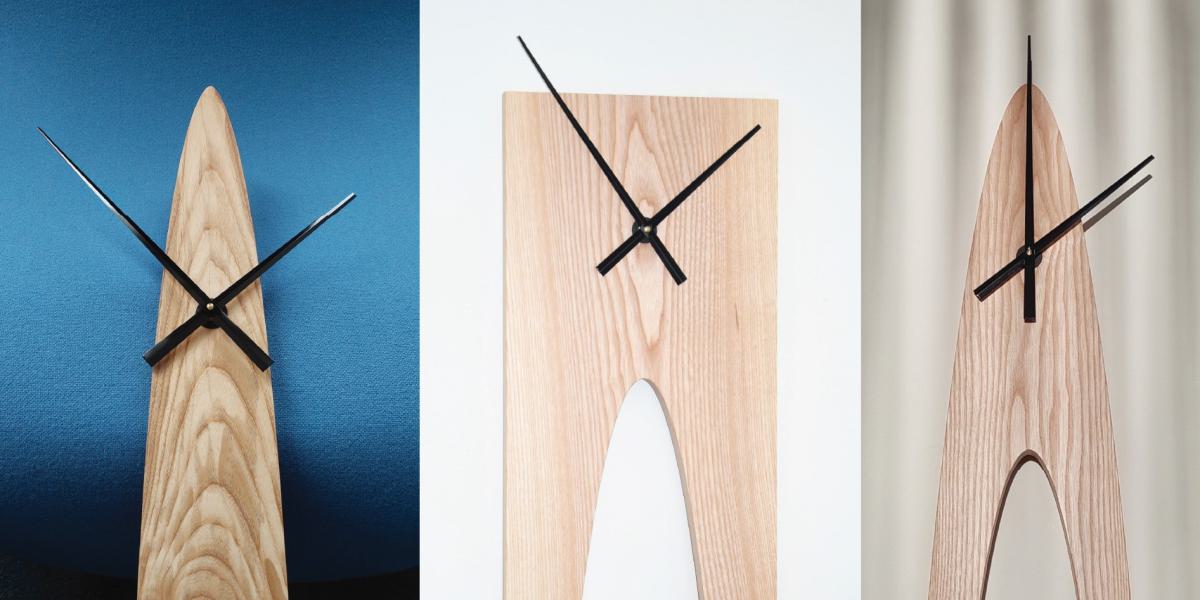 Trampoli is a series of clocks inspired by a natural map of time, the growth rings of trees. The four clocks fit together and can be made from a single plank of wood. In addition, the use of material is minimized by the thin design, without compromising on size, to create a striking eye-catcher. The smallest clock is also made separately from scrap wood. The wood and the placement of the drawing are carefully chosen. Each clock is unique because the wood grain is always different.