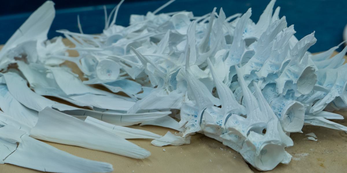 “Blue Bone” was born of serendipity: fish bones turned blue under high firing. Comparing bones by region, species, and body size revealed subtle shifts in tone and intensity. The cause is likely heavy metals accumulated in the bone—copper, iron, manganese—and is thought to be linked to marine pollution, habitat differences, and metal-rich aquaculture feed: marks of the Anthropocene.
