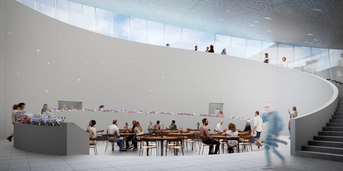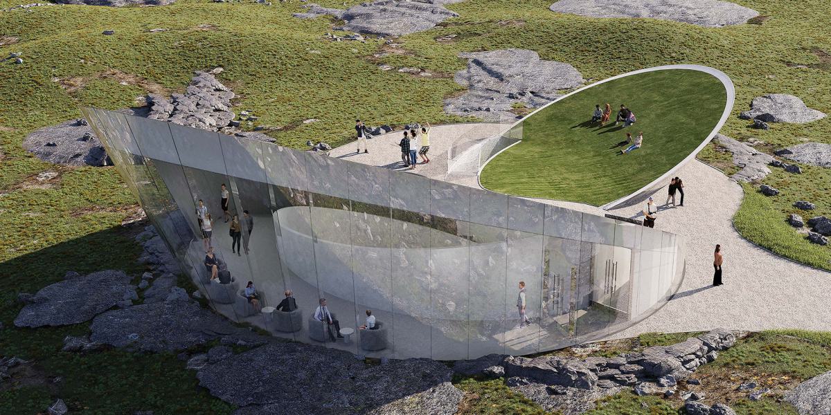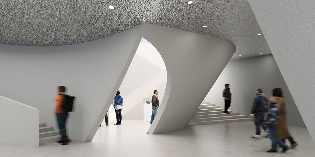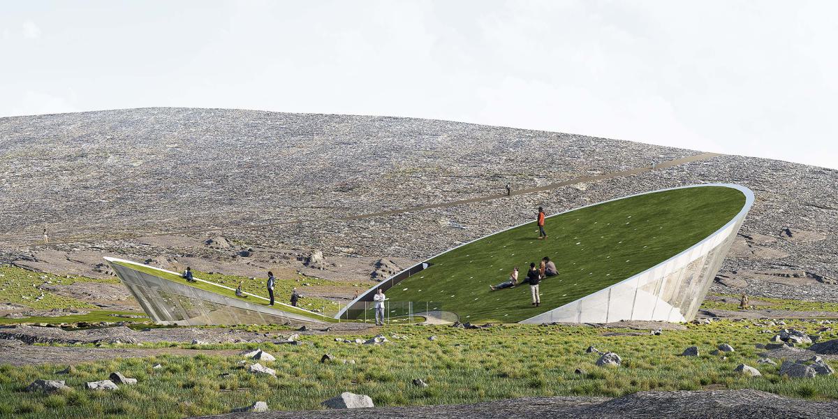 The project is inspired by Iceland’s volcanic landscapes, including a café, exhibition space, and roof terrace. A Möbius strip circulation connects the spaces, offering a continuous experience above and below ground. The design reduces energy use and reflects a strong commitment to sustainability.