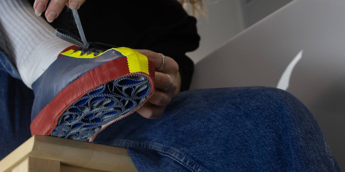 From Waste to Sneakers explores sustainable footwear by transforming industrial waste into a mono-material sneaker. By experimenting with components and materials, the project created a full prototype that highlights the potential of reusing resources over producing new materials.