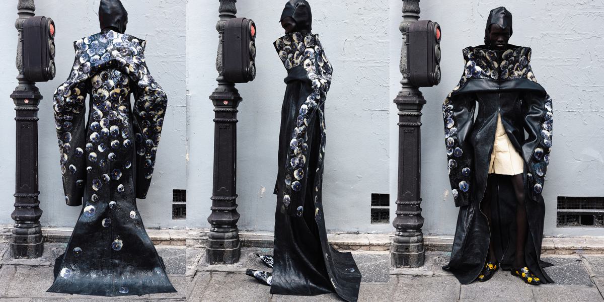 Coat from pansies, urethane rubber and deadstock leather sponsored by Ecco Leather.