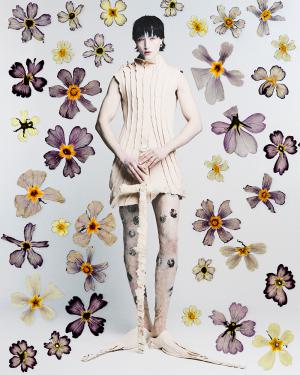 A playful metaphor to the secretly queer cardinal. Covering himself in a long cassock with a sense of restriction. Embellished with fresh preserved pansies from my hometown in a shiny material. Referencing the way flower names were used as derogatory terms for queer people in the beginning of the 20th century.
