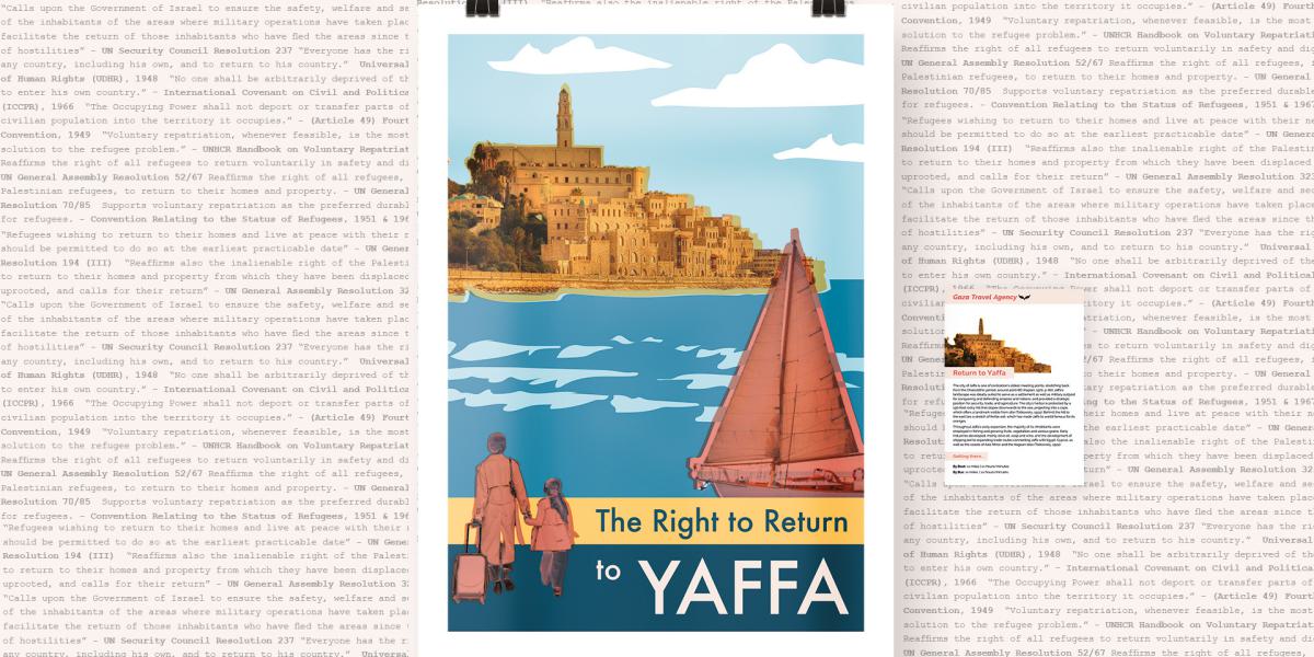 Het Recht op Terugkeer voor Palestijnse vluchtelingen is duidelijk vastgelegd in het internationaal recht en bevestigd door meerdere VN-resoluties, maar het is lange tijd buiten de mainstream politieke discussie gehouden. In plaats daarvan ligt de focus op mislukte kaders zoals de “twee-statenoplossing”, die de kern van het onrecht van verdrijving negeert, of op voorstellen die neerkomen op verdere etnische zuivering — het geweld dat vandaag in Gaza plaatsvindt. Tegen deze achtergrond staat Gaza Travel Agency binnen een bredere beweging die stelt dat terugkeer de enige humane, legale en duurzame oplossing is. Door dit werk te tonen in een publieksgericht ontwerp festival dragen we bij aan het zichtbaar, bespreekbaar en voorstelbaar maken van het Recht op Terugkeer — niet als een verre droom, maar als fundament voor gerechtigheid, en coëxistentie.