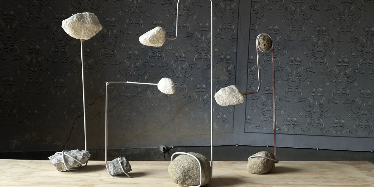 Gefascineerd door de verscheidenheid aan natuurlijke vormen verzamelden we stenen in verschillende maten van bergen, rivieren en stranden. We bogen aluminium buizen rond elke steen, wat leidde tot een boeiende dialoog tussen de natuurlijke vorm en het industriële materiaal dat zich aanpaste aan de steen.