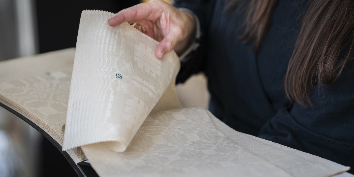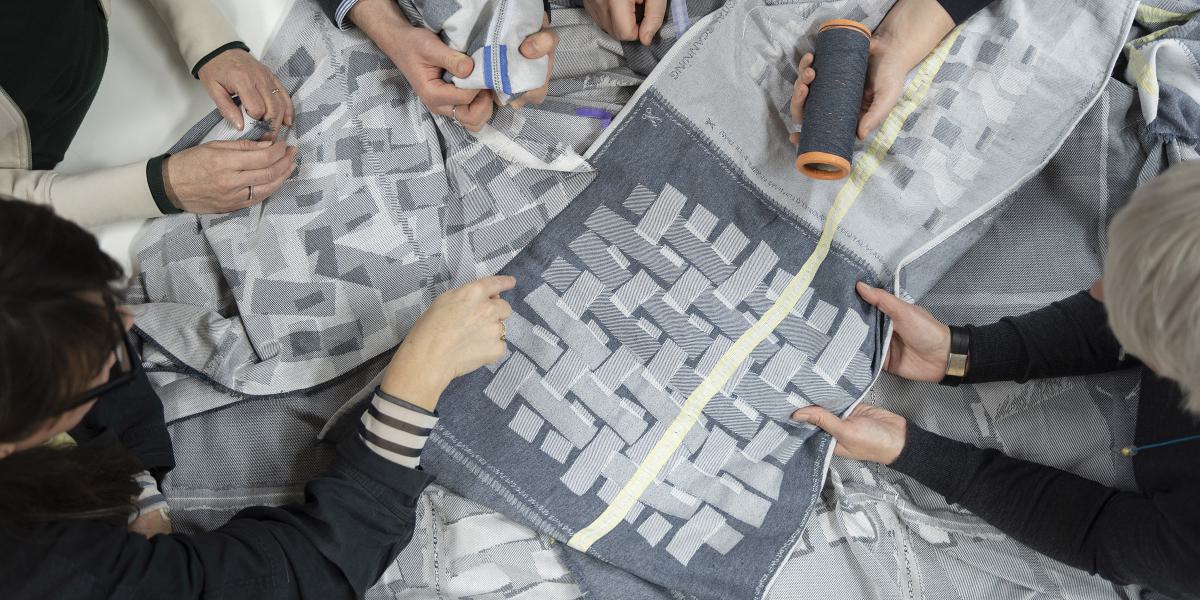 by TextielMuseum presenteert Re_Work, circulair tafelgoed ontworpen door designcollectief Envisions, ontwikkeld in het TextielLab Tilburg. Geïnspireerd op pellendamast uit de TextielMuseum-collectie en geweven met Spinning Jenny’s gerecyclede garens, verenigt het erfgoed, innovatie en transparantie.